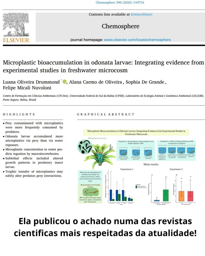A revista é a Chemosphere, e a pesquisa é sobre microplástico em libélula: “Bioacumulação de microplásticos em larvas de odonata: integrando evidências de estudos experimentais em microcosmos de água doce”